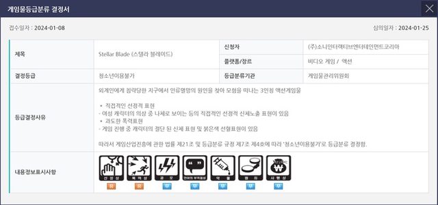 《劍星》(Stellar Blade) 分級 青少年不可使用 在地球上擊敗侵略地球之外星人宿敵,尋找人類倖存者, 一部第三人稱動作冒險遊戲。 -直接的煽情表現。 在女性角色的服裝中,有直接的身體裸露表現。 -過度使用暴力的表現。 遊戲的角色有身體被截斷,血液四散噴濺之演出。 根據遊戲產業振興相關法第21條及遊戲分級相關規定第7條第4項, 將等級評為「青少年不可使用」 https://i.imgur.com/c5AGzk6.png