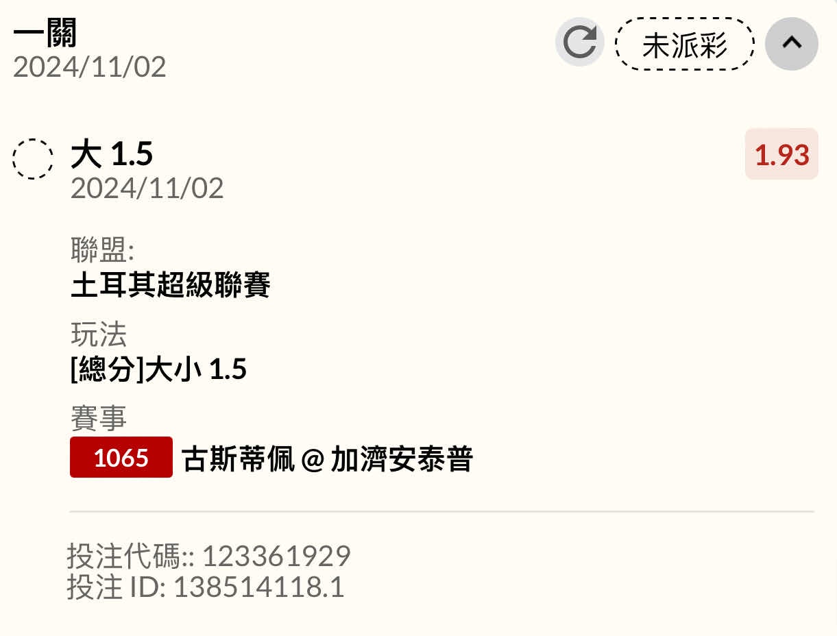 有發文好像比較會過? 上一場孬剛乖乖開2-3球,我就不會買和局了 既然上一場躲過2-3球還賺了0-0的和局 古斯蒂佩 @ 加濟安泰普 這場目前1.5大已經有賠率~ 場中進場1.5大1.8 50K 過了等我明天回來發奶~ -- 運彩屢屢賽事取消「走地」 彩迷訐譙:開飯店還怕人吃 https://news.ltn.com.tw/news/society/breakingnews/3274899 -- ※ 發信站: 批踢踢實業坊(pttbestweb.org.tw), 來自: 103.234.206.243 (臺灣) ※ 文章網址: https://pttbestweb.org.tw/SportLottery/M.1730483131.A.C92