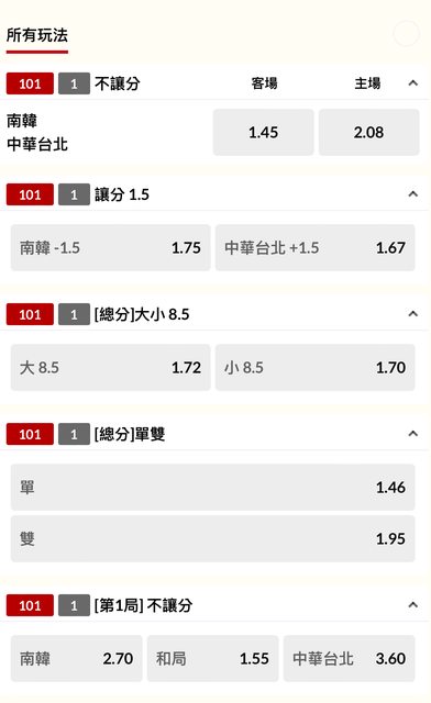 主推大分賠率1.72、副推愛國選項中華隊不讓賠率2.08
