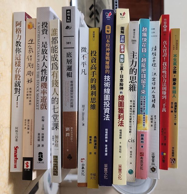 我理工科的只針對問題去找答案 不知道什麼時候進出場就學技術分析 技術分析正確卻沒漲就學籌碼K怎麼用 每次漲跌都情緒恐慌就學情緒管理 資金管理就看理財相關書籍學習 我先從看書開始,這是我半年來看過的書 還有一些書借朋友沒拍到 https://i.imgur.com/w4xj0wK.jpg