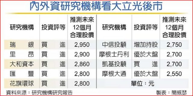彙整內外資大型研究機構對大立光股價預期,瑞銀證券於法說會後上調為2,950元,居外