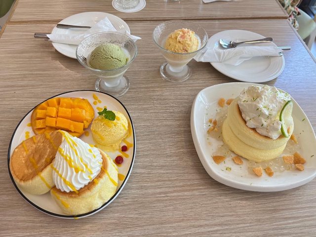 我們點了兩個厚鬆餅+兩款冰淇淋