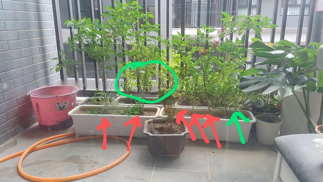 照片中,紅色標誌是辣椒(品種不記得了),綠色是九層塔