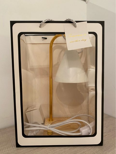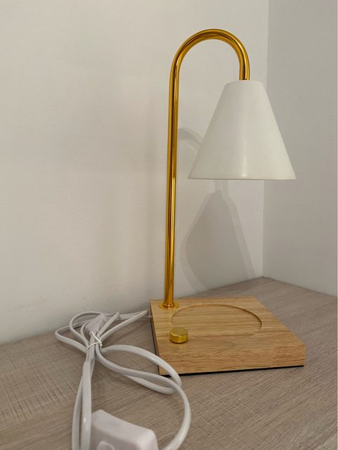 物品說明:可插電式融蠟燈,線的部分有按鈕可開關燈、燈台上有旋轉式的按鈕可以調節