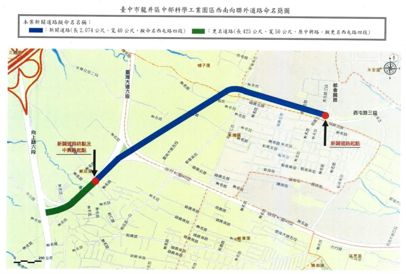 中科西南向聯外道路開闢工程,西起龍井區中興路(特五號),終點銜接西屯區西屯路三段,
