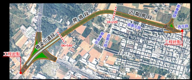 線交叉口止,全長約2公里、路寬40公尺。施工過程中,為降低對原有交通的影響,工程採