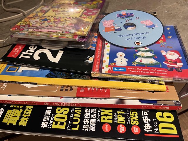 皮長夾、電子辭典、手搖鈴、明治奶粉送的側背包、過期雜誌、英語童謠CD