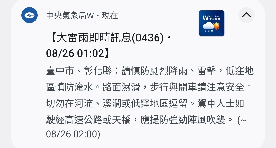 → edc59429 : 簡訊那是“災防告警通知“,不是大雨及豪雨特報 08/26 00:28