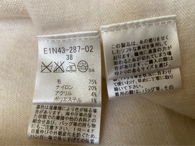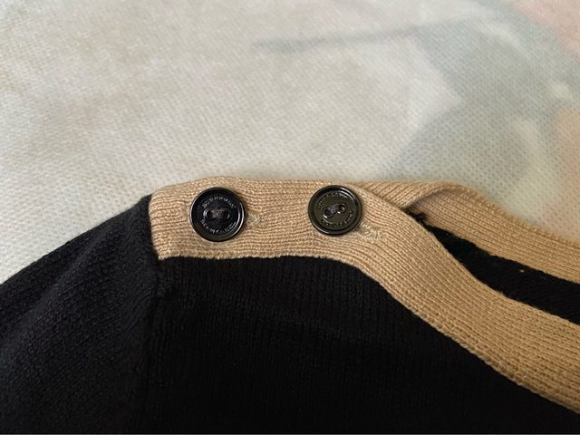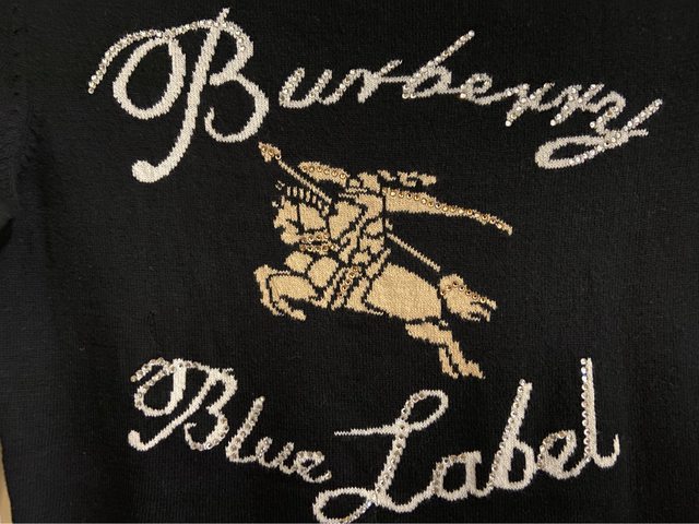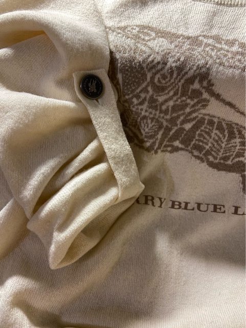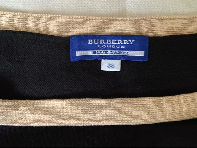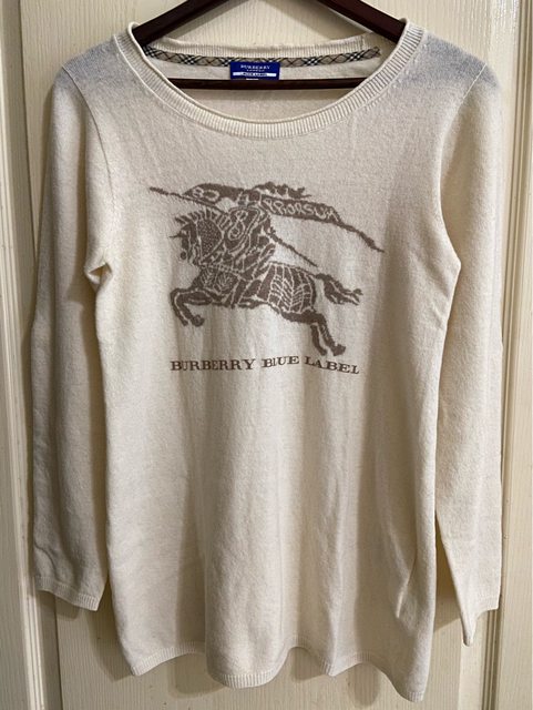 38號 九成新 無褪色 水鑽完整 七分袖 100%棉 但有一處縫補過 因為是黑色 我穿上覺得不明顯 介意勿購買 3.Burberry blue label 米白色戰馬標誌羊毛上衣 1490含郵局運費