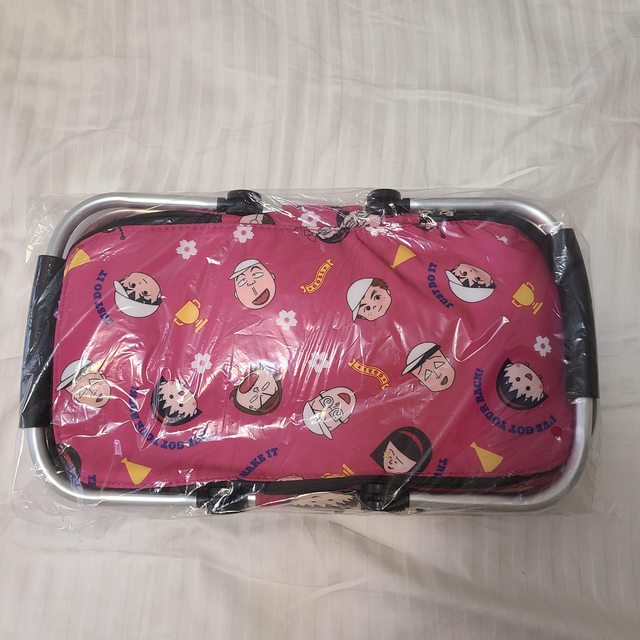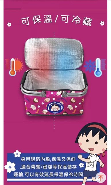 5.全新小丸子路跑野餐籃$150 尺寸寬23、長42、高23(公分) 材質:外層尼龍滌綸、內部鋁膜保溫層、鋁合金框架、可摺疊、鋁框可拆、有底板