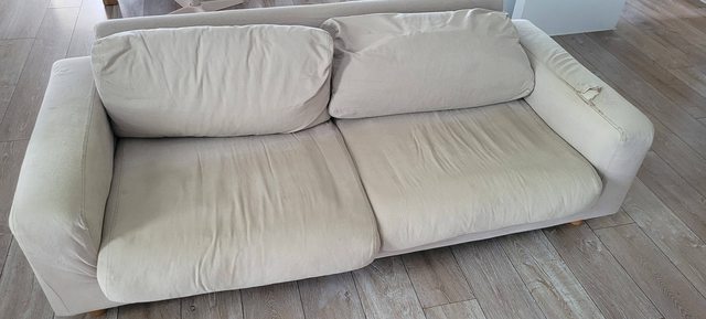 物品說明:10+年的muji2.5人座羽毛沙發,也被貓各種蹂躪10+年,如圖,有另一棕色沙發