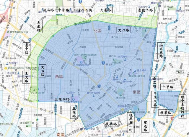 7.南屯區:大誠里(部分)、同心里(部分)、大同里、文心里、惠中里(部分)、大業里、溝墘里(部分)。