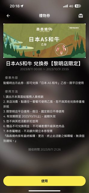物品名稱:森森燒肉黎民店日本A5和牛兌換卷