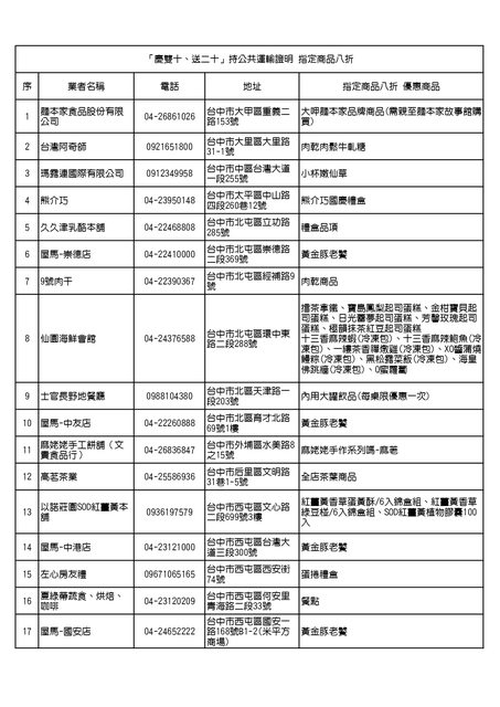 糕餅、伴手禮及鍋烤店家響應「慶雙十送二十」來台中打8折:為歡迎各地遊客前來台中,把握觀光商機,串聯糕餅公會、好禮協會、商圈、捷運沿線及鍋烤店家,推出國慶連假(10/7~10),憑高鐵票、火車票等公眾運輸抵臺中之證明,享部分商品8折或店家專屬優惠。