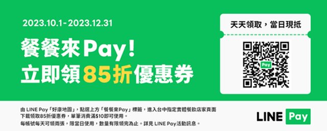 10/1-12/31LINE Pay用戶可透過「好康地圖」領取台中-指定實體餐飲店家的LINE Pay 85折優惠券(每個帳號每日限領2次)