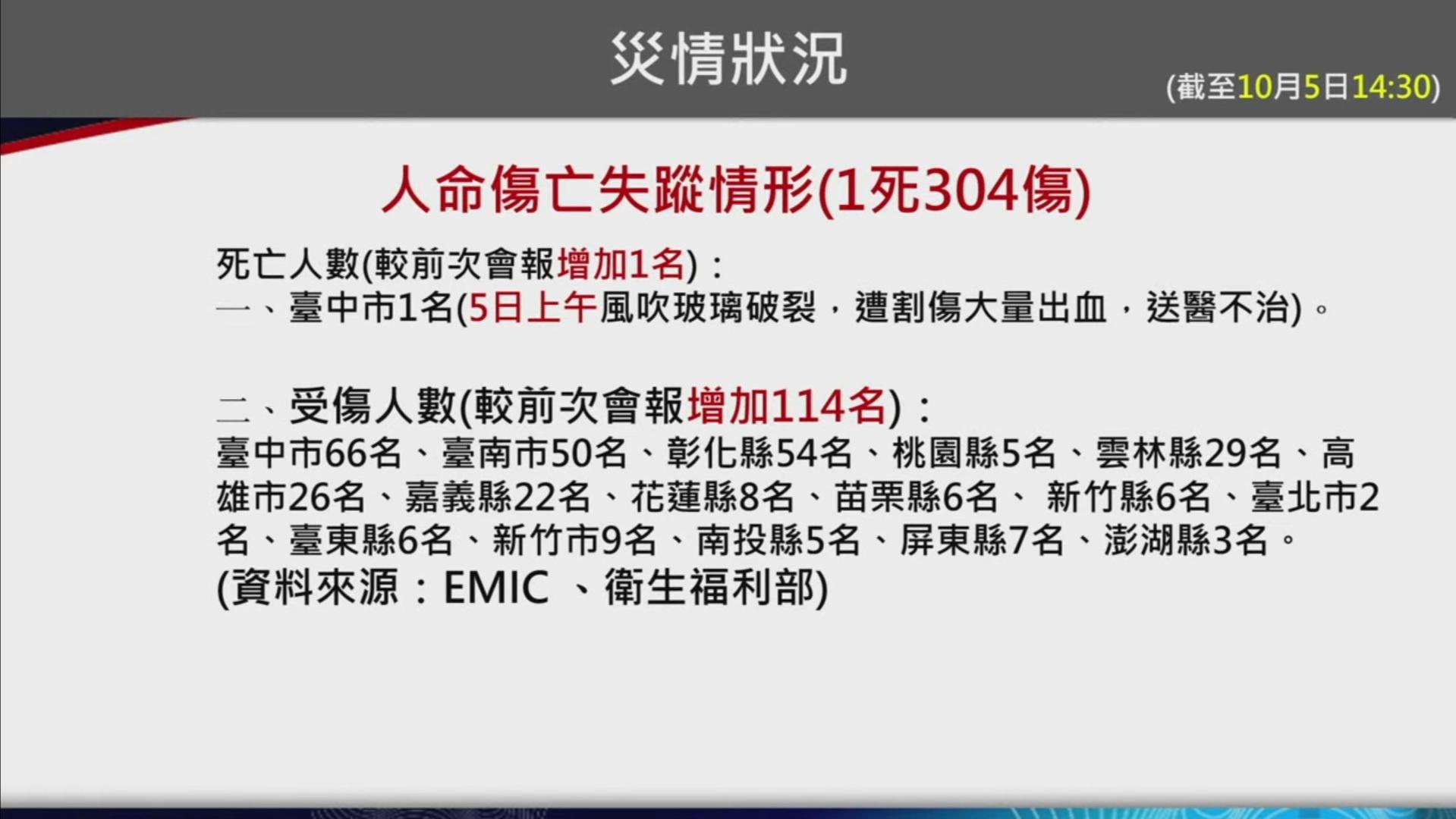 小犬颱風造成台中死亡災情,台中市大安區一名84歲婦人今在家流血過多,送醫急救不治,