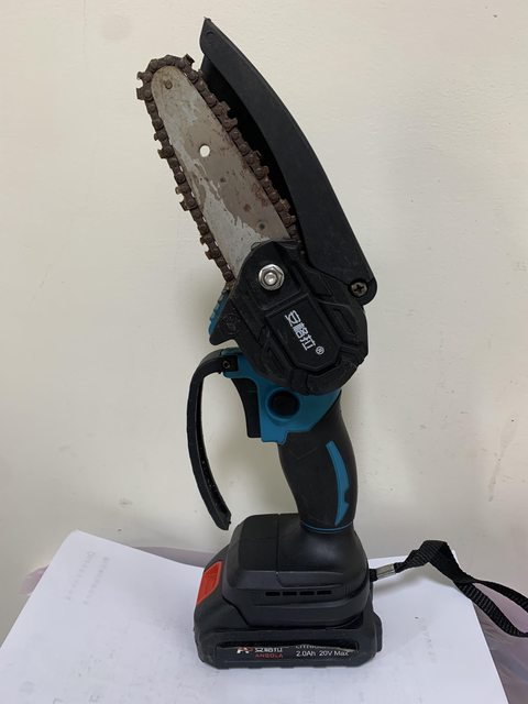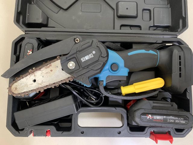 4吋電動鏈鋸,附兩顆20V鋰電池,充電器,螺絲起子,手提工具盒。