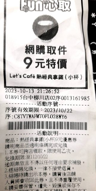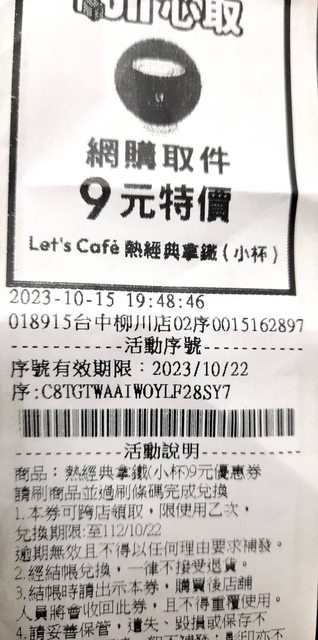物品名稱:全家 熱經典拿鐵(小) 9元券