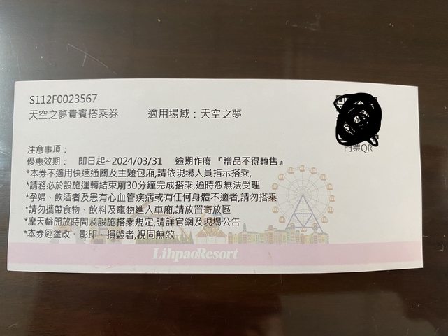 標題[贈送] [贈送]沙鹿 麗寶樂園摩天輪搭乘券一張