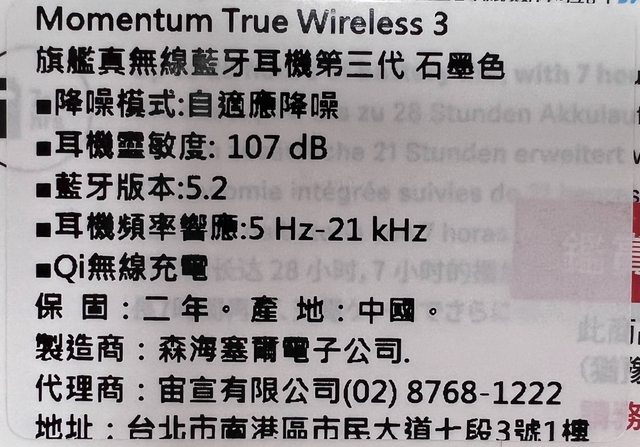 【型號】MOMENTUM True Wireless 3 旗艦真無線藍芽耳機第三代 石墨色