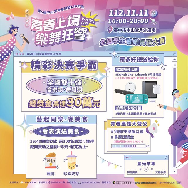 中山堂青春競藝LIVE秀11/11決戰台中 限量雞排、珍奶免費送