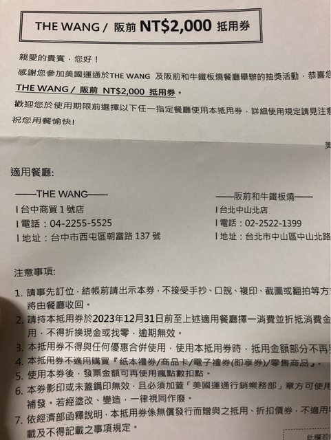 標題[交易]潭子/The Wang/阪前抵用卷