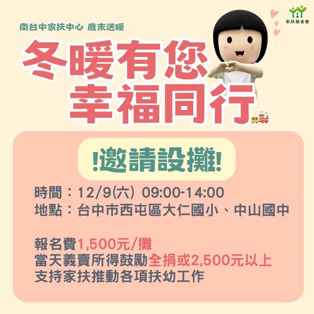 → seyfried : 關懷弱勢宗旨,除攤位捐款外,請每灘至少捐贈新台 11/22 00:48