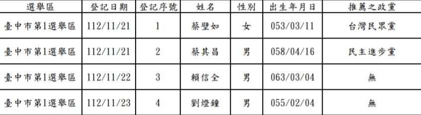 推 fspmlp : 中一選區共有4人登記(KMT資深黨員劉燈鐘則是以無 11/25 14:52