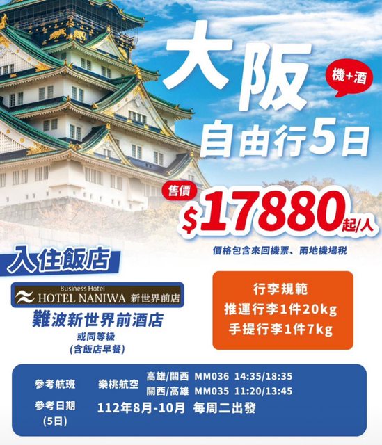高雄<->大阪 五天四夜雙人往返機票+住宿