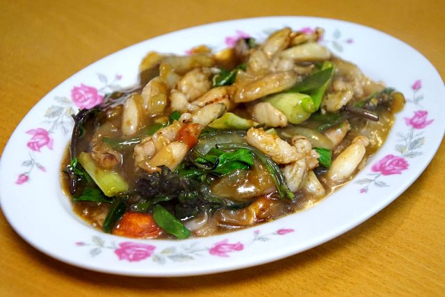 炒蟹管肉,常見的九層塔醬炒作法,吃起來勾芡的感覺比較重,口味也偏甜了些。