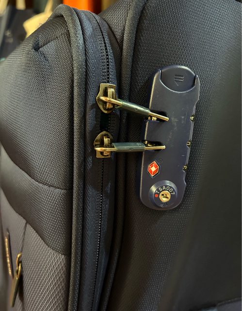 前方小分隔袋的拉鍊板為塑膠,因疫情多年未出過,它膠化黏黏斷裂,但用迴紋針套上,