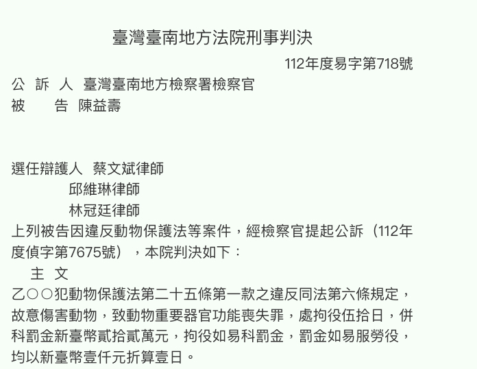 法官認陳故意傷害動物,致動物重要器官功能喪失罪處拘役50日,併科罰金22萬元,可上