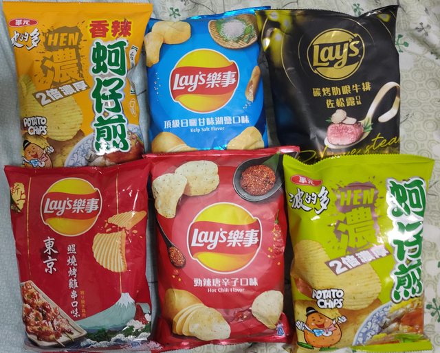 25. 洋芋片59.5克(松露28包 湖鹽3包 照燒4包 唐辛子4包 蚵仔煎原味15包 辣味7包) ,一包售25元,有效期限2024/2/13