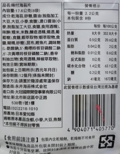19. 厚切烤海苔20克有22包(梅子22 椒鹽0),1包售40元,有效期限2024/3/23