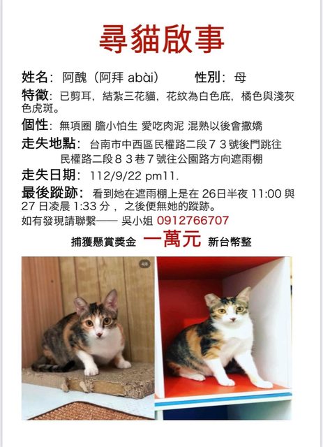 標題[失蹤] 中西區氣象台附近三花貓咪走失