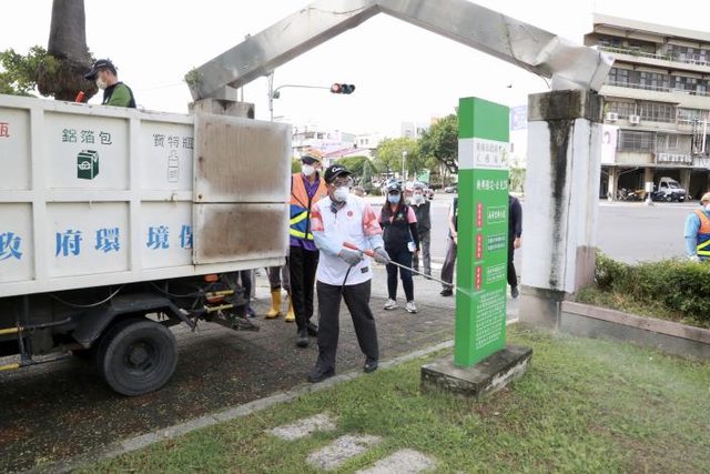 黃偉哲今(7)日也前往南區慰勞環保志工,並加入化學噴藥協助工作。黃偉哲表示,因