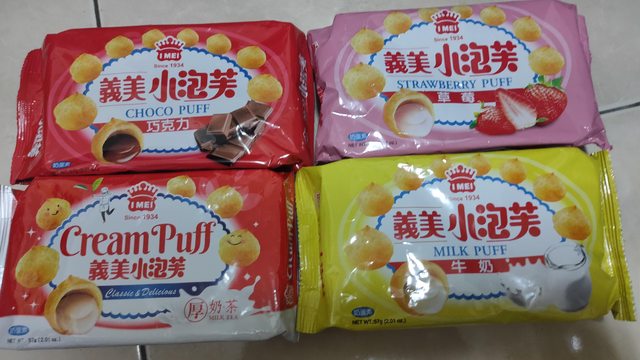 9. 義美小泡芙(牛奶28包 厚奶茶12包 巧克力28包 草莓27包),一包售25元