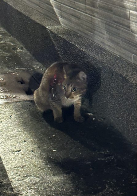 晚上大約6:30左右在北區北成公園路邊看到一隻有紅色背帶(有鈴鐺)的貓咪