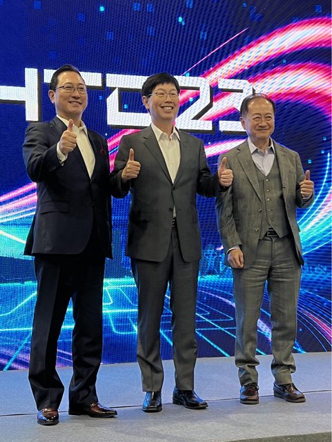 鴻海半導體策略長蔣尚義(右起)、董事長劉揚偉、EV策略長關潤,在2023年鴻海科
