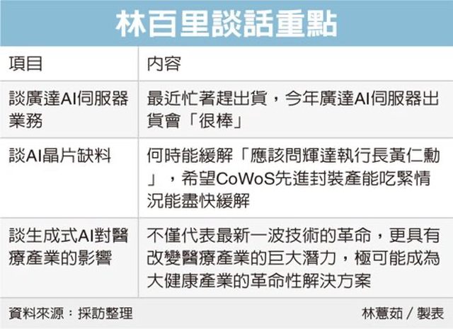 AI應用在全球發燒,AI伺服器代工大廠廣達(2382)董事長林百里昨(4)日透露,「最