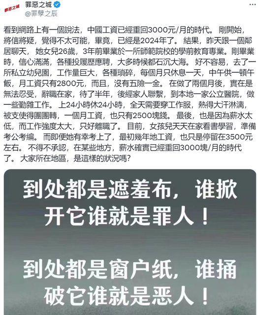 中國人的月薪都回到人民幣2-3000元了