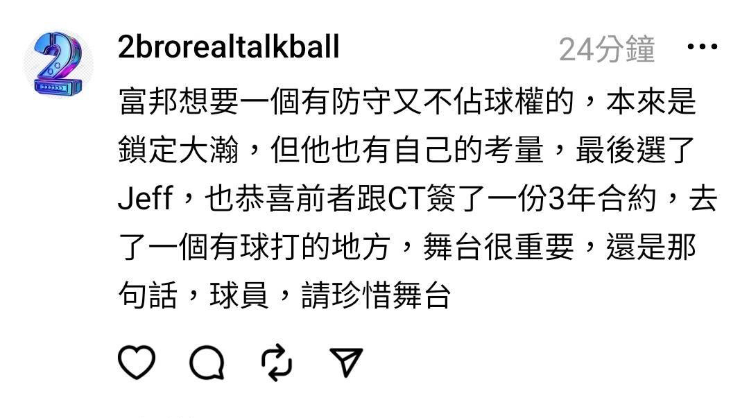 推 ge12346 : 去富邦幹嘛啦 又沒上場時間 08/01 15:18