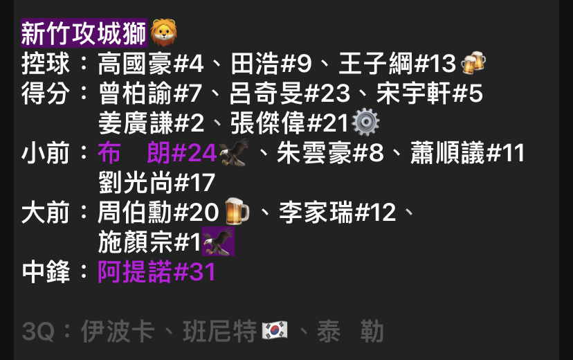 → Alipapa : PG田浩/SG高國豪/SF曾柏喻/PF張傑瑋/C阿提諾 穩了! 09/18 14:42