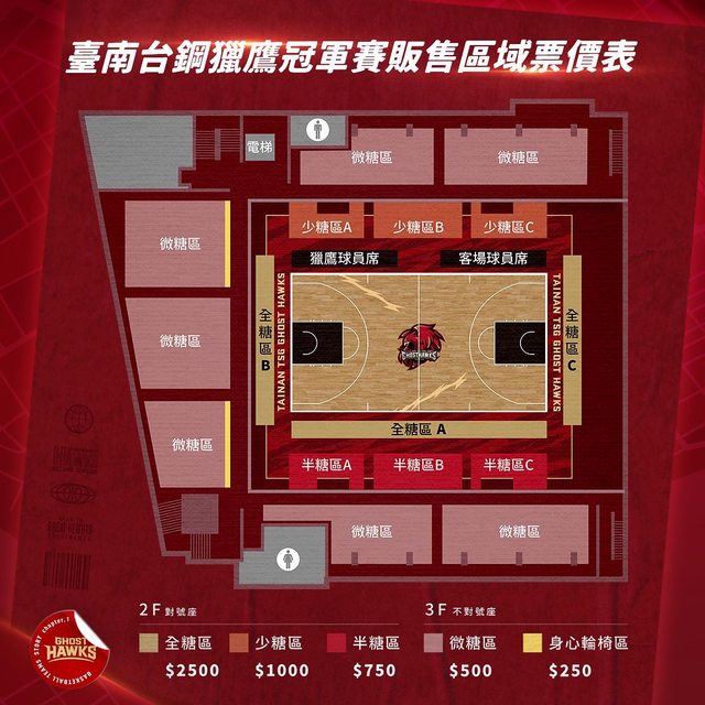 可以看到上季鋼鐵人不只因對手不同而有差別票價(鋼鐵英雄身障席例外)從最便宜300~400到最貴3000~3100,不過鑒於雄中體育館辦HBL比賽的經驗,光是要規劃鋼鐵英雄身障席就難度不小了,在已經被籃球場佔據了一樓絕大部分面積的一樓擠出規劃搖滾區的空間又更加困難,何況還有一堆行政行銷工作組如商品部門、雅典娜(鋼鐵人啦啦隊)之類的等待安排。