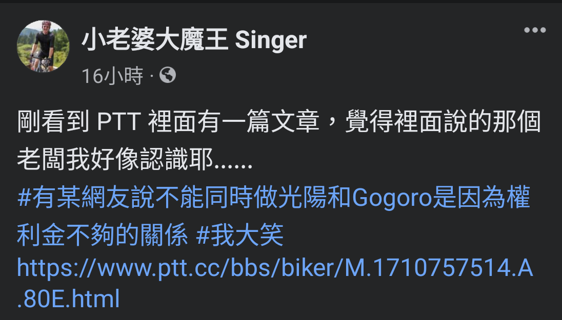 → kutkin: 他要做光陽又做GOGORO 應該是他自己權利 112.78.80.55 03/18 20:33
