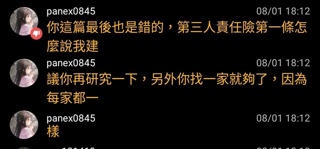 → panex0845 : 我處理過幾千件責任險理賠 我可以負責任告訴你 承保08/02 14:00