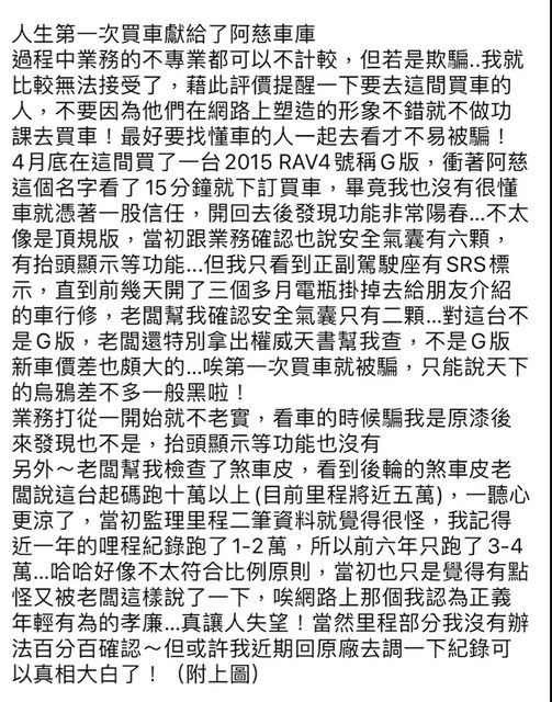 推 XUPJPVUP : 車主沒發現就算了?內控這麼差,出事推給業務。 08/31 16:08