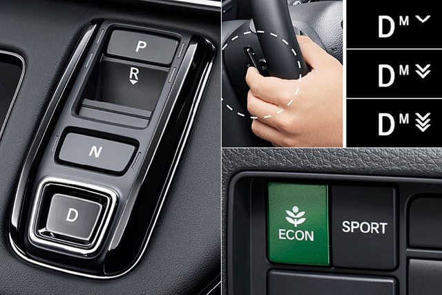 用按鍵式檔位切換,並提供 ECON 節能和 Sport 運動共兩種駕駛模式,而方向盤後方的撥