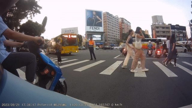 新光三越商圈的行人穿越道時,不顧行人仍在斑馬線上,旁邊還有義交吹哨、比手勢,仍