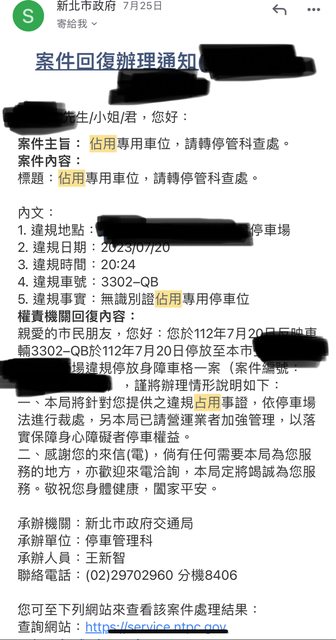 標題:佔用專用車位,請轉停管科查處。